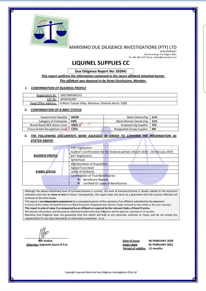 LIQUINEL SUPPLIES CERTIFICATE E354